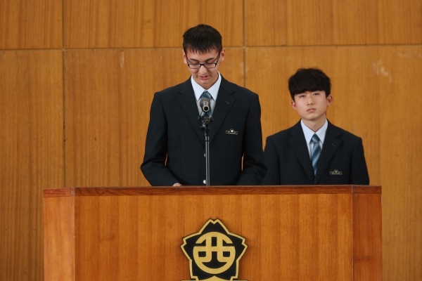候補者からそれぞれの所信表明が語られたのち、全校から寄せられた質問のうち二つについて、各候補者が回答しました。