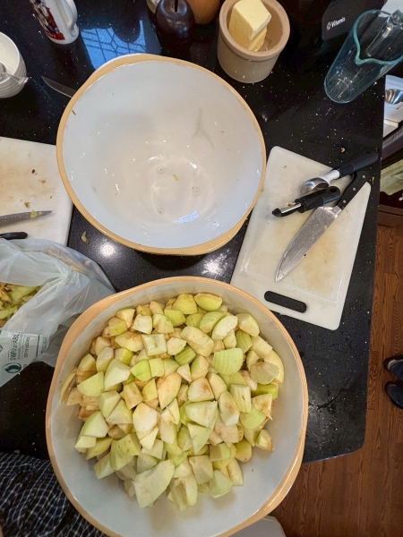 お昼頃から料理の準備が始まりました。私はスタッフィングとアップルパイ作りを手伝いました。家にりんごの木があるため、自家製のりんごを使ったアップルパイを作りました。ホストマザーと一緒に20〜30個のりんごの皮むきをしました。りんごの皮を途切れさせずに丸く切るのは難しく苦戦しました。