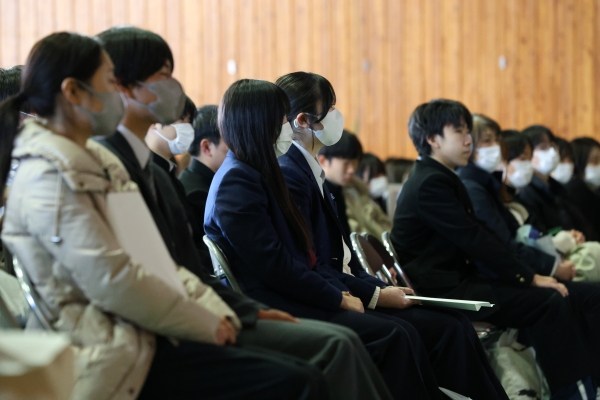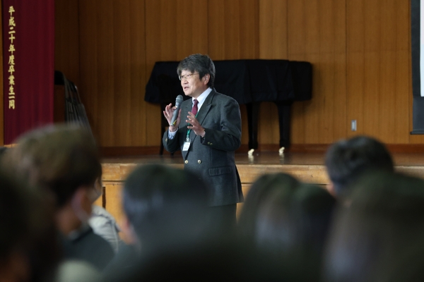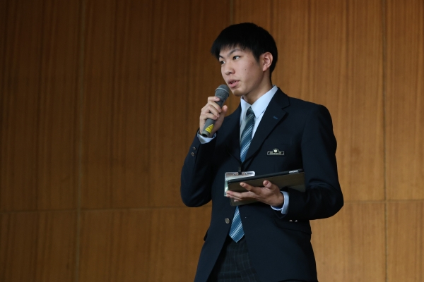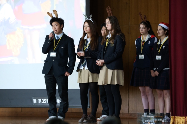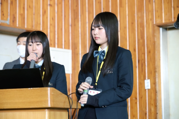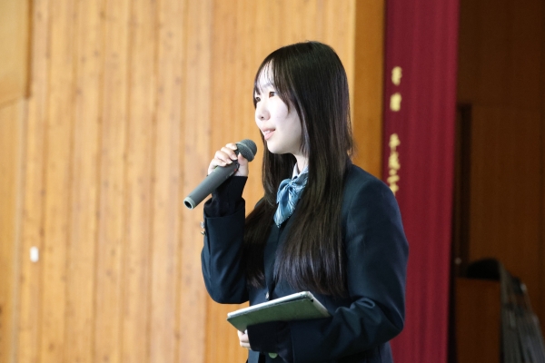 吹奏楽部によるマーチング演奏をお聴きいただいたのち、修学旅行の様子、大学合格を決めた3年生の体験談、、留学紹介、本校の特長などを聞いていただきました。