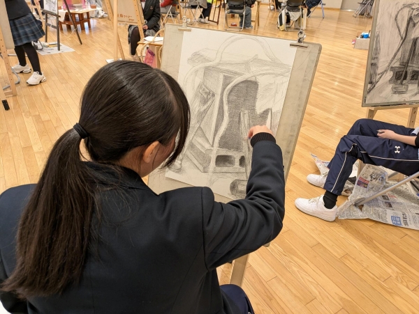 これまで経験したことのない制作時間、モチーフ、物量で初めてのことが多く、生徒にとって非常に難しい課題で合ったと思います。しかし、頭を悩ませながらも、他校の先生方からもご指導を受け、真摯に目の前のデッサンに取り組んでいました。