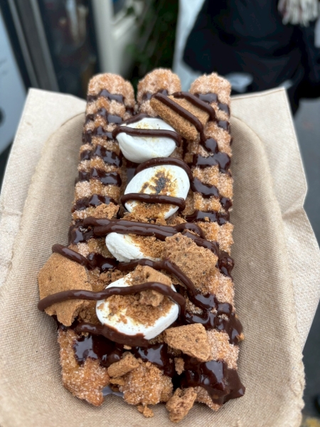 クリスマスマーケットにはハンドメイドの置き物やアクセサリー、クリスマスのオーナメント、食べ物など様々な物が売っていました。特にハンドメイドの商品は手作りならではの温かみや可愛らしさを感じました。美味しそうなチュロスに惹かれみんなでチュロスを食べました。チュロスに3つのトッピングができ、私はマシュマロ・クッキー・チョコソースを選びました。チュロスと3つのトッピングは相性がとても良く美味しかったです。