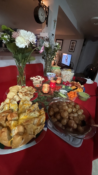 月曜日、VABでのレッスン後、友人のホームステイ先のクリスマスパーティーに招待してもらいました。友人のホームステイ先の室内は、クリスマス仕様に飾り付けられ大きなクリスマスツリーやくるみ割り人形があり可愛いかったです。また、ホストマザーが美味しそうな料理やお菓子を準備してくれていました。食卓には、野菜やスナック、ホストマザーの手作りミートボール、チーズトースト、クッキーなどの沢山の料理が色鮮やかに並べられて、食欲がそそられました。生野菜やクラッカーにワカモレやハマスをつけて食べました。日本ではワカモレやハマスを食べたことがなかったですが、相性がよく美味しかったです。特にミートボールとチーズトーストは、手作りの温かさが伝わる料理で美味しくおかわりをしました。手作りクッキーは程よい甘さとホロホロした食感でいくらでも食べられる味でした。