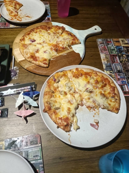 Day 3 In Japanese class, everyone made and ate lamingtons together. We also played with a ball. It was very fun. After that, I went to English class. I searched and read the Shakespeare story in Japanese, but the story was very difficult. After school, I went to a manga art class. Iseult was very good at drawing. When I got home, my host mother made pizza for dinner. It was very delicious. After dinner, I watched the movie Jujutsu Kaisen 0 with Iseult. We enjoyed it together.
