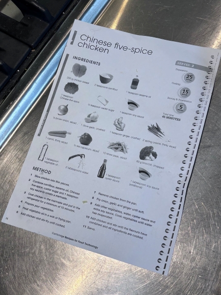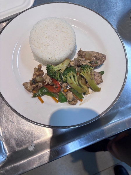 今日は、私が選択した料理の授業に初めて参加しました。友達3人と「Chinese five-spice chicken」というチキンと野菜の炒め物を作りました。授業内で完成させられるよう、みんなで協力して急いで調理しました。BDCのキッチンはプロが使う場所のように広く、さまざまな道具がそろっていました。 先生の英語を一生懸命聞き取り、分担された作業をすべてやり遂げることができました。いつもより英語をたくさん話せて、理解もできたと感じました。また、友達のスカイという女の子が日本語や英語を使って親切に説明してくれたので、本当に嬉しかったです。 野菜炒めには、玉ねぎ、にんにく、ブロッコリー、生姜、にんじん、パプリカ、さやえんどう、ねぎなど、多くの種類の野菜を使いました。私は普段あまり料理をしませんが、野菜それぞれに合った切り方を学んだので、今度は家族に作ってあげたいと思いました。 2時間の授業で料理を完成させることができました。お米もフライパンで炊き、みんなで盛り付けをしました。こちらで食べるお米はパラパラしていて、日本のものとの違いが興味深いと感じました。火加減の調整は難しかったですが、協力してスムーズに完成できて嬉しかったです。 皿洗いや片付けまでしっかり終わらせ、先生から合格をもらえました。その後、料理の写真を撮ってから食べました。味がしっかりしていて、すべての野菜とチキンに味がよく染みていてとても美味しかったです。残りはお土産として持ち帰りました。 新しい材料や調理道具の英語も覚えることができ、とても良い勉強になりました。友達と一緒に行う料理の授業が好きなので、次回も楽しみです。