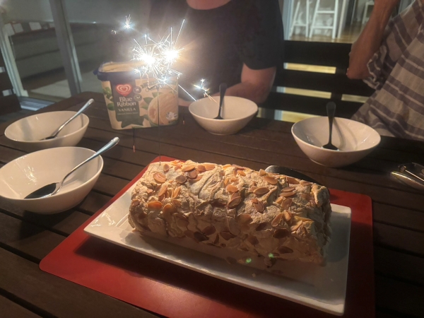 On the weekend, I stayed at Penny’s grandparents’ house. I played a board game called Rummi-O at Penny’s grandparents’ house. It was a fun board game that I’ve never played in Japan. Also, I ate pavlova after dinner. It was very delicious. There were a lot of fruits in the pavlova. I got a souvenir when I got there. I got the same gumnut baby pouch, post card, and a single flower insert similar to the tote bag I got last time. It’s all handmade by Penny’s grandmother. It was very fun.