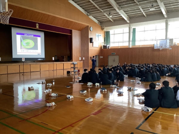 3時間目は修学旅行説明会を行いました。行き先である台湾について、面積や人口、民族や宗教などをクイズ形式で学び、生徒たちは選択肢のパネルの前に移動しながら積極的に参加していました。また、日本との違いとして、道路が右側通行であることや、電車内での飲食には罰金があること、食事のマナー(麺をすするのはNG、げっぷはOK)などについても学びました。
